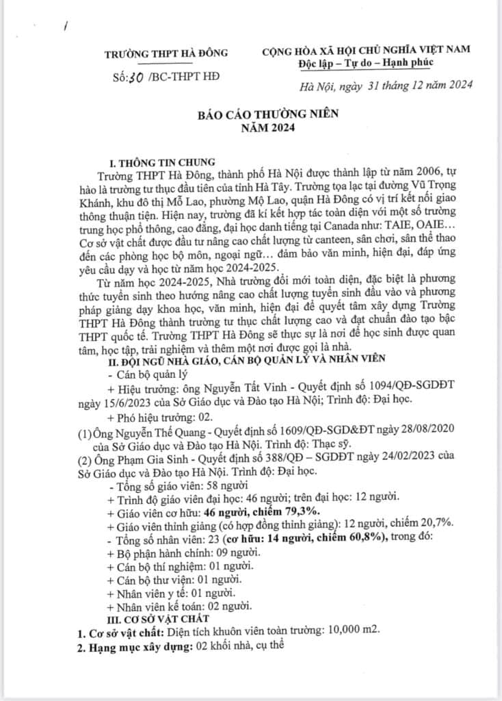 Báo cáo thường niên năm 2024 Đăng vào 05/06/202525/03/2026 bởi Kim Thuỳ Hương Xem thêm: Luật Phòng, chống mua bán người Học 2 buổi/ngày với mức học phí thấp nhất, THPT Hà Đông tiếp tục tuyển sinh lớp 10 Đánh giá từ cộng đồng 900 Học sinh tham gia trải nghiệm huấn luyện quân sự năm 2025 Chốt lịch thi tốt nghiệp THPT 2025 Bài viết cùng chủ đề: Thông tin tuyển sinh lớp 10 năm 2026 Thông tin tuyển sinh lớp 10 năm 2026 Chính sách mới trong tuyển sinh lớp 10 Chúc mừng 495 học sinh tốt nghiệp THPT sớm năm 2026! Nhiệt liệt chào mừng ngày nhà giáo Việt Nam 20/11/2025! Lễ khai giảng năm học 2025 – 2026 Đoàn viên thanh niên Trường THPT Hà Đông vinh dự và tự hào tham gia Lễ diễu binh, diễu hành ngày Quốc khánh 2/9.Đảng Cộng sản Việt Nam quang vinh, muôn năm! THPT Hà Đông bổ sung 225 chỉ tiêu, xin chúc mừng các em 2k10! Tuyển sinh bổ sung 5 lớp 10 năm học 2025 – 2026 Biên bản thực hiện công khai trong hoạt động của trường THPT Hà Đông năm học 2025 – 2026 Quyết định công khai trong hoạt động của trường THPT Hà Đông năm học 2025 – 2026 Hồ sơ công khai trong hoạt động của trường THPT Hà Đông năm 2025 – 2026 Lễ bế giảng năm học 2024 – 2025 Trại hè Canada 2025 Hồ sơ công khai trong hoạt động của trường THPT Hà Đông năm 2024 – 2025 Quyết định công khai trong hoạt động của trường THPT Hà Đông năm học 2024 – 2025 Chiêu sinh khóa trại hè miễn phí năm 2025 Hồ sơ công khai trong hoạt động của trường THPT Hà Đông năm 2025 – 2026