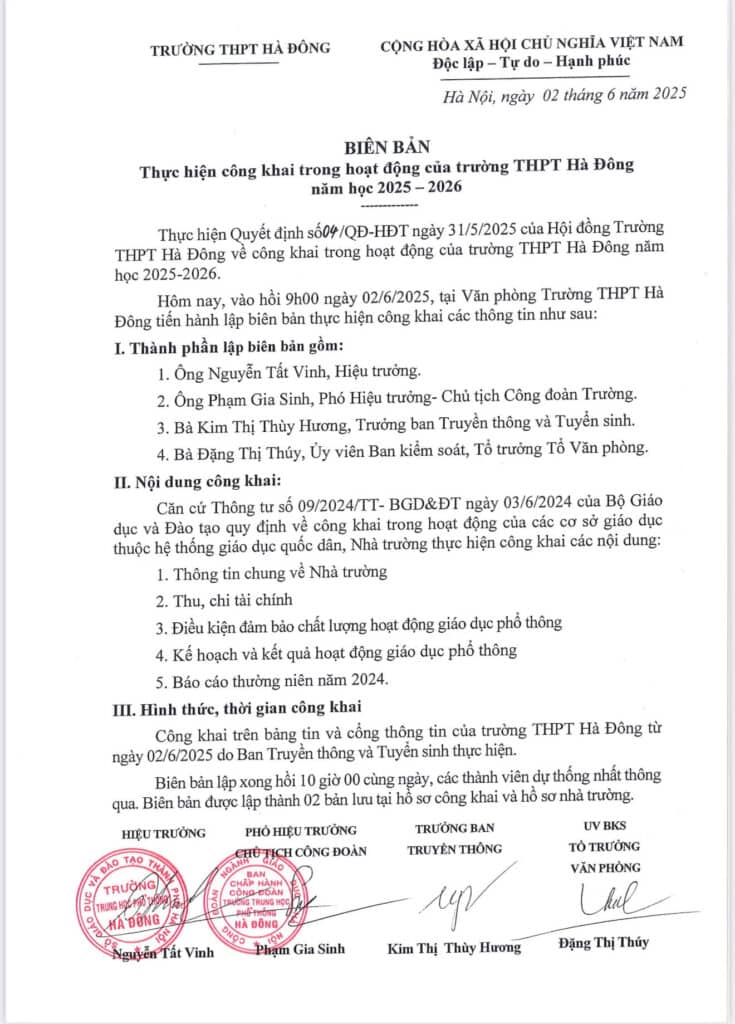 Biên bản thực hiện công khai trong hoạt động của trường THPT Hà Đông năm học 2025 – 2026 Đăng vào 05/06/202526/02/2026 bởi Kim Thuỳ Hương Xem thêm: TUYÊN TRUYỀN, GIÁO DỤC PHỔ BIẾN PHÁP LUẬT CHO HỌC SINH Chính sách mới trong tuyển sinh lớp 10 Đánh giá từ cộng đồng GẶP NHAU CUỐI NĂM 2010 Đại hội Công đoàn Trường THPT Hà Đông nhiệm kì 2023-2028 Bài viết cùng chủ đề: Quyết định công khai trong hoạt động của trường THPT Hà Đông năm học 2025 – 2026 Hồ sơ công khai hoạt động của trường THPT Hà Đông năm 2025 – 2026 Báo cáo thường niên năm 2024 Lễ bế giảng năm học 2024 – 2025 Trại hè Canada 2025 Hồ sơ công khai trong hoạt động của trường THPT Hà Đông năm 2024 – 2025 Quyết định công khai trong hoạt động của trường THPT Hà Đông năm học 2024 – 2025 Biên bản thực hiện công khai trong hoạt động của trường THPT Hà Đông năm học 2024 – 2025 Quyết định công khai trong hoạt động của trường THPT Hà Đông năm học 2025 – 2026 Tuyển sinh bổ sung 5 lớp 10 năm học 2025 – 2026
