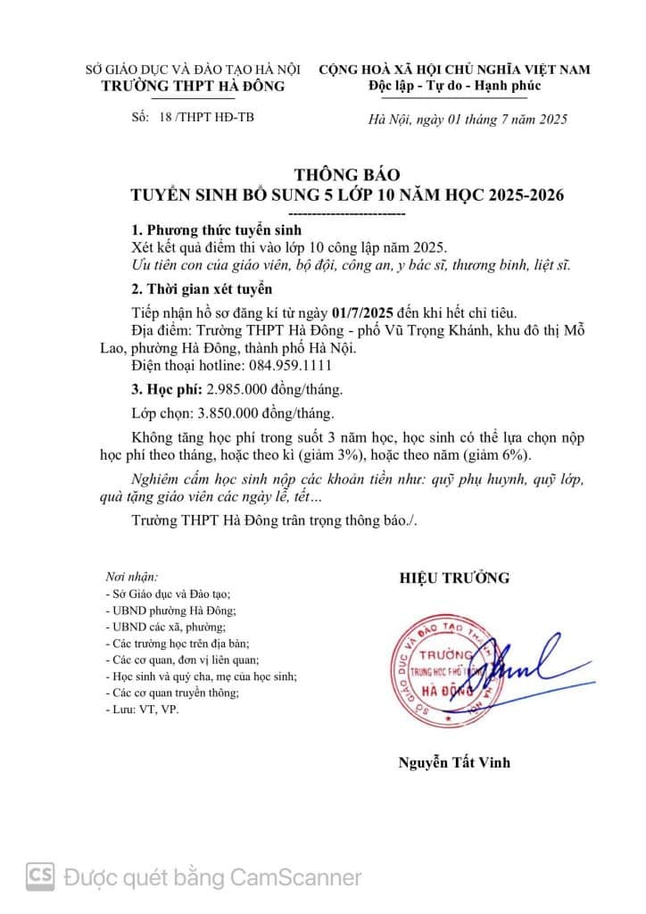 Tuyển bổ sung 30 chỉ tiêu vào lớp 10 Trường THPT Hà Đông
